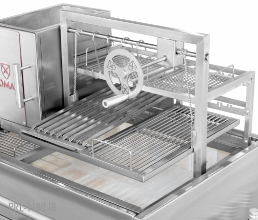 A grelha em sistema elevatório com volante frontal possibilita o ajuste fino da altura, oferecendo total domínio sobre o ponto de preparo dos alimentos. Já o suporte para espetos, robusto e funcional, acomoda múltiplos espetos simultaneamente, tornando a parrilla extremamente versátil para diferentes tipos de cortes e preparos.